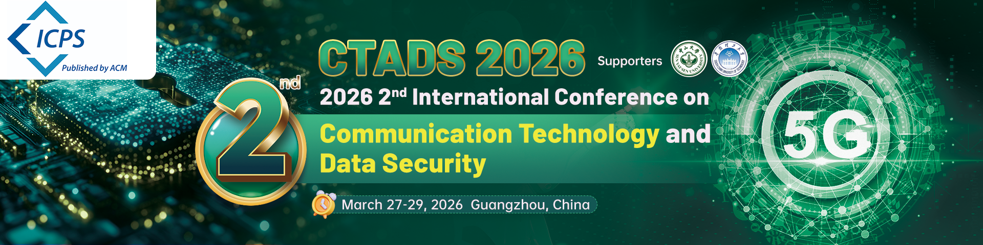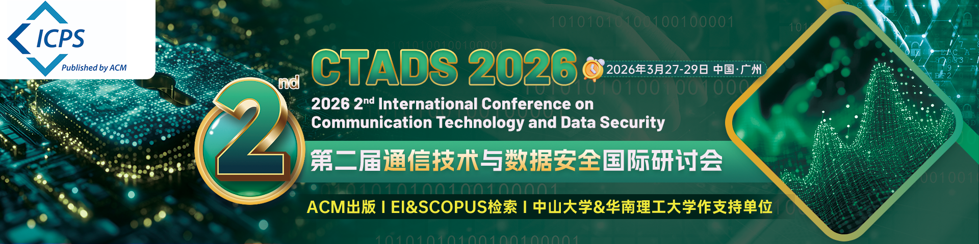 2026 2nd International Conference on Communication Technology and Data Security (CTADS 2026) will be held in Guangzhou from March 27th to March 29th, 2026. The conference will focus on cutting-edge fields such as wireless communication, 5G/6G, the Internet of Things, network security, encryption technologies, and blockchain. It aims to promote innovation in communication technology and data security, build a platform for academic and industry exchange, and foster cross-disciplinary collaboration and technological advancement. We sincerely invite experts and scholars worldwide to submit original papers, share the latest research findings, and jointly discuss industry hotspots and challenges. The conference will feature keynote speeches, oral presentations, interactive sessions, and more. We look forward to your active participation. Researchers, engineers, and professionals from all sectors are warmly welcomed to submit papers and register to attend this grand event, together creating a new future for secure communication in the digital era!